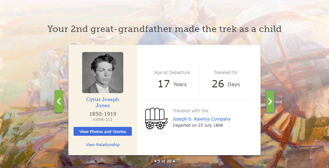 1868 Arrive New York - 1868 Joseph S. Rawlings Company. Thomas JONES and Mary WILLIAMS Jones and Children Sarah Jane (19) Cyrus Joseph (17) Willard Thomas (16) Mary Emma (13) Albert Williams (11) Marlin John (10) Leonard James (8) Herbert Ernest (3) (7 or their fifteen children had died in England).